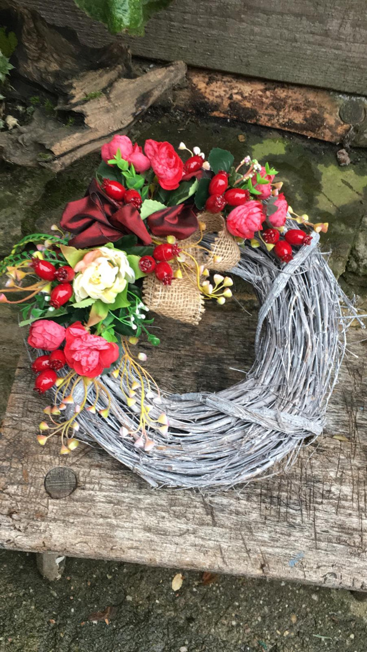 Podzimní věnec průměr 30cm, možno použit na dveře, nebo dušičkovy věnec. Cena 400,-