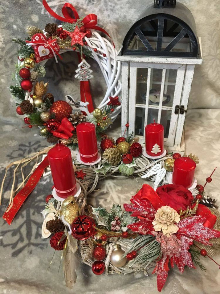 Vánoční věnec na dveře a adventní věnec se svíčkami na stůl v klasické červenozlaté