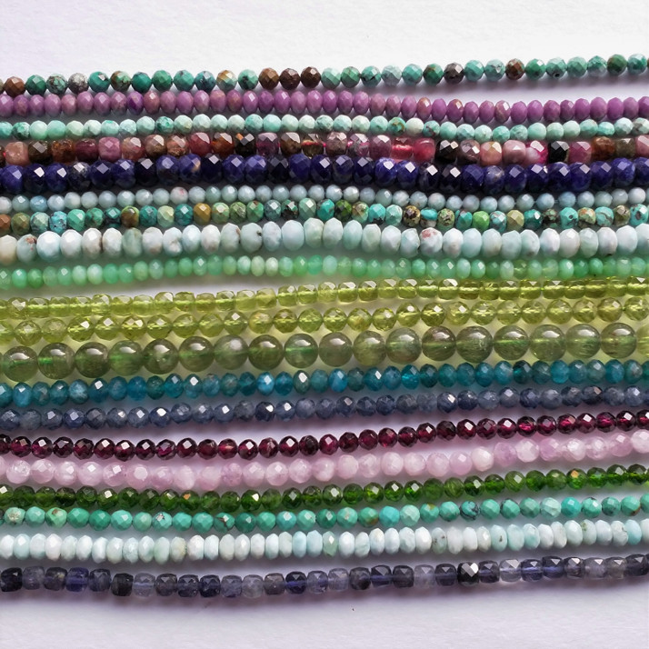 tyrkys, fosfosiderit, larimar, turmalín, sodalit, chryzokol, chrysopras, olivín, apatit zelený a modrý, iolit, granát rodolit, kunzit, chromdiopsid.