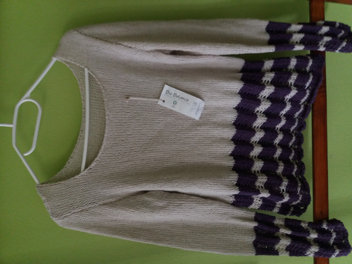 Halenka béžová s tmavě fialovou bordurou, příze Bio Balance od BC Garn, vel. M, větší výstřih,délka zad 53cm, délka rukávu 62 cm.