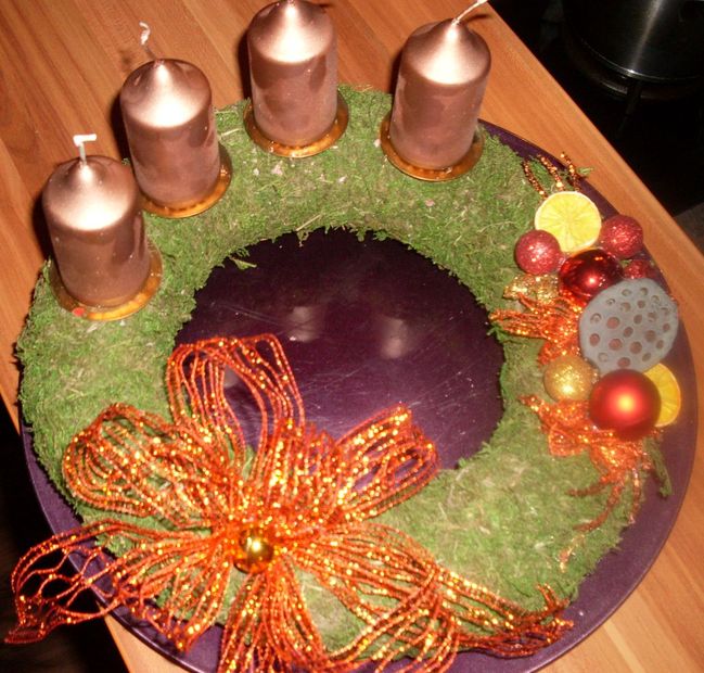 Oranžovo zlatý adventní věnec na mechovém základu. Dále použity drobné vánoční ozdoby, sušené ovoce, svíčky a stuha.