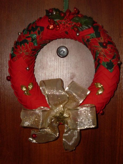 Vánoční věnec na dveře. Zdobený technikou patchwork, doplněno drobným zdobením a stuhou.