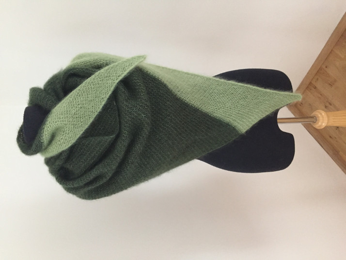 Ručně pletený asymetrický šátek z luxusní příze, zaujme svou jednoduchostí a kombinací lahvově zelené a barvy jablka.