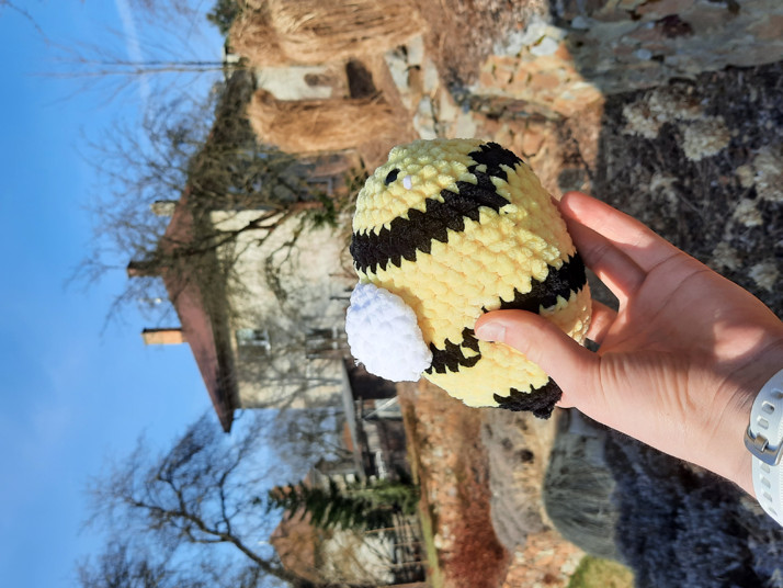 Žlutočerná háčkovaná včelka s bílými křídly.