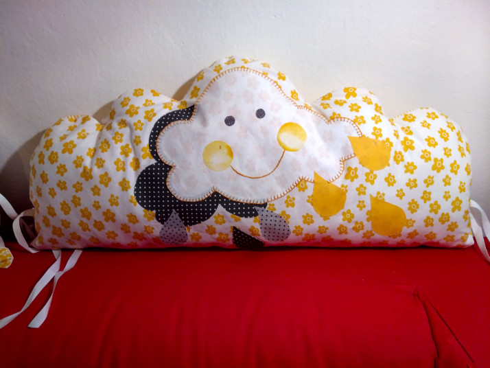 Měkoučký mráček- součást mantinelu do postýlky pro mou vnučku.Ušito z bavlněných látek, uvnitř duté vlákno, všita bavlněná šňůrka pro přivázání v postýlce.