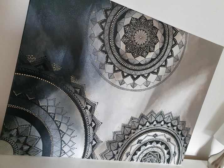 Mandala malovaná akrylovými barvami, fixou a dodělana tekutými perlami