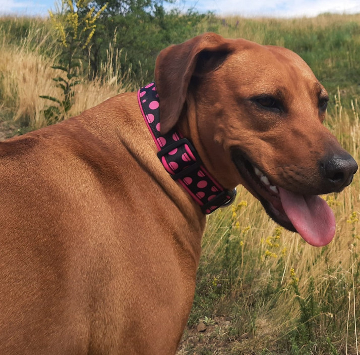 Obojek Pink Polka Dot je vyrobený ze softshellu, který pejska nikde netlačí.