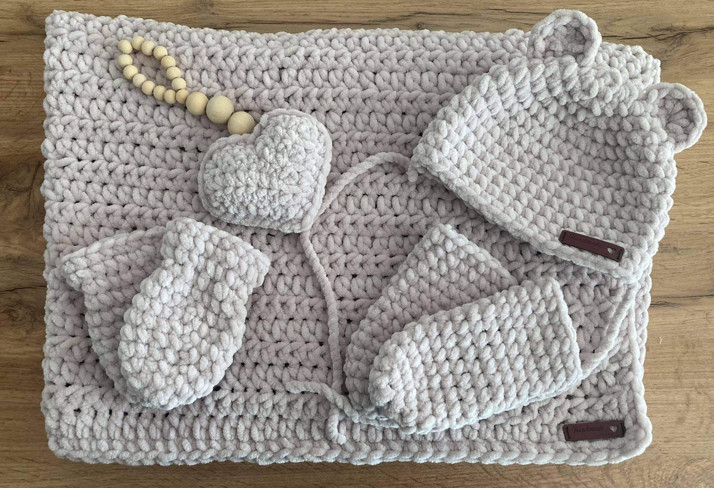 Set čepičky,rukavic,ponožek + srdíčko na kočárek. Ideální na cestu z porodnice nebo jako dárek pro novorozence.