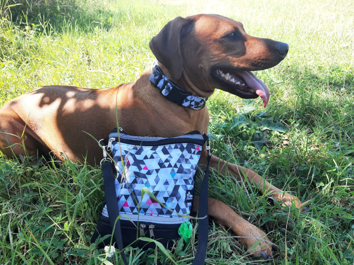 Imma v softshellovém obojku Grey Triangle + venčící kabelka ve stejném vzoru.