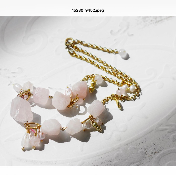 Náhrdelník z velkých surových růženínů s řetízkem pozlaceným 24 karátovým zlatem je ozdoben ručně vyrobenými přívěsky z růženínů, kultivovaných perel a pozlacených komponentů. Je dlouhý 55 a má 5 Cm prodlužovacī řetízek.