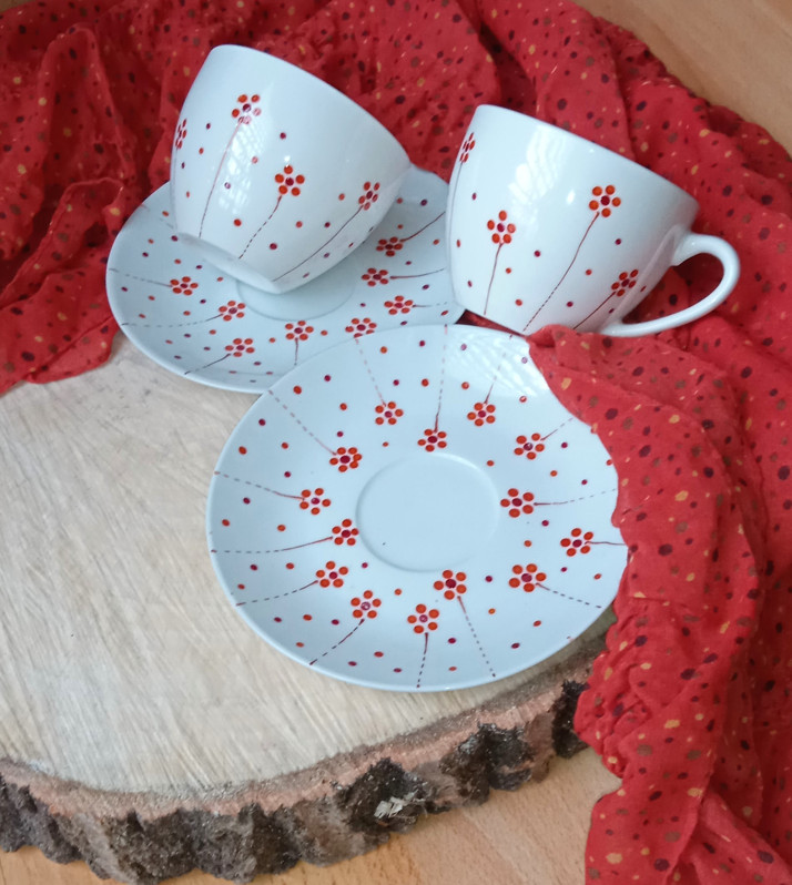 Ručně malovaný porcelánový hrnek s podšálkem v oranžovo - hnědém provedení.
