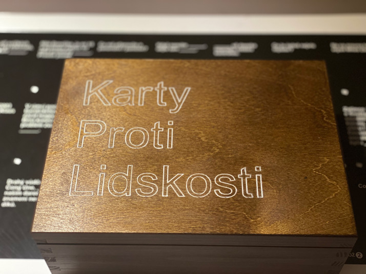 Karty Proti Lidskosti - ořechová krabička s gravírováním a bílou akrylovou výplní.