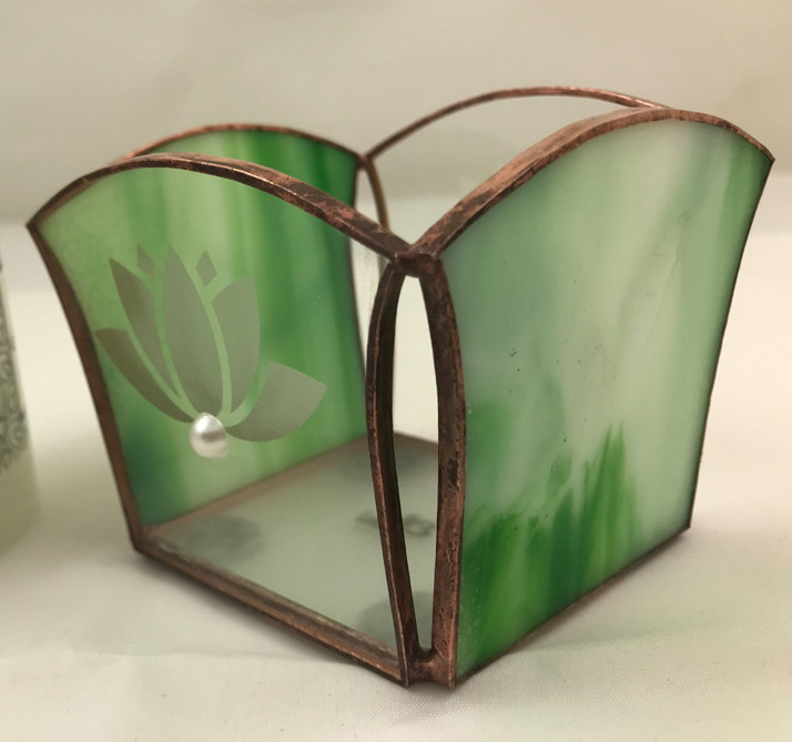 svícen tiffany, kombinace pískovaného a opalescentního skla, dozdobení perličkou