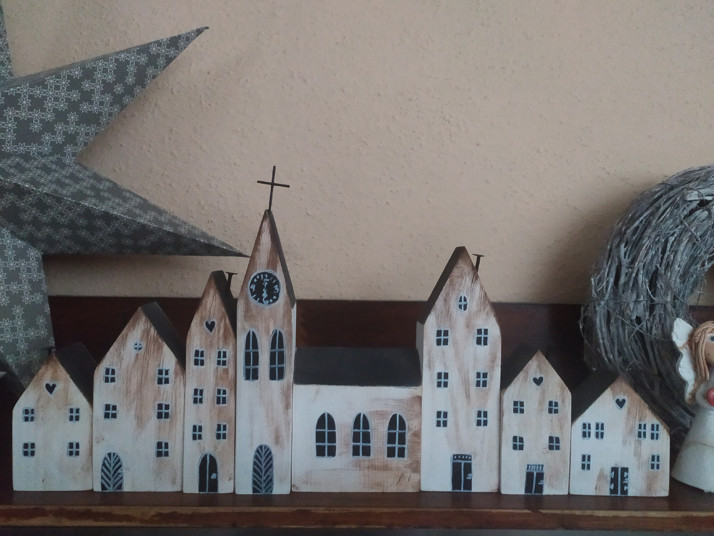 Ručně dělané dřevěné vesničky,malované klasickými barvami na dřevo.