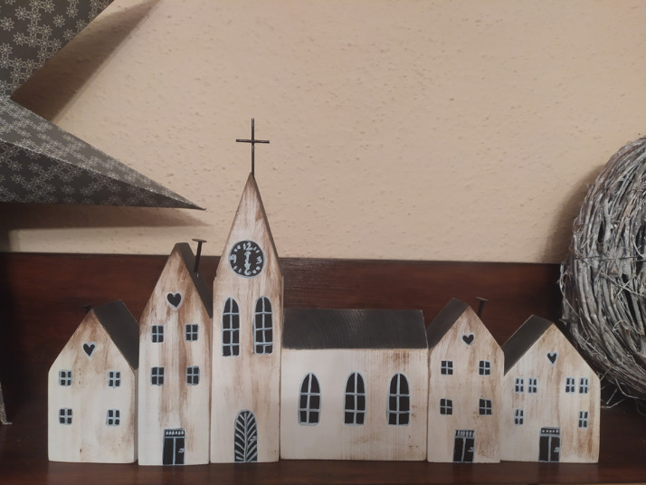 Ručně vyráběné dřevěné domečky, malované barvami na dřevo.