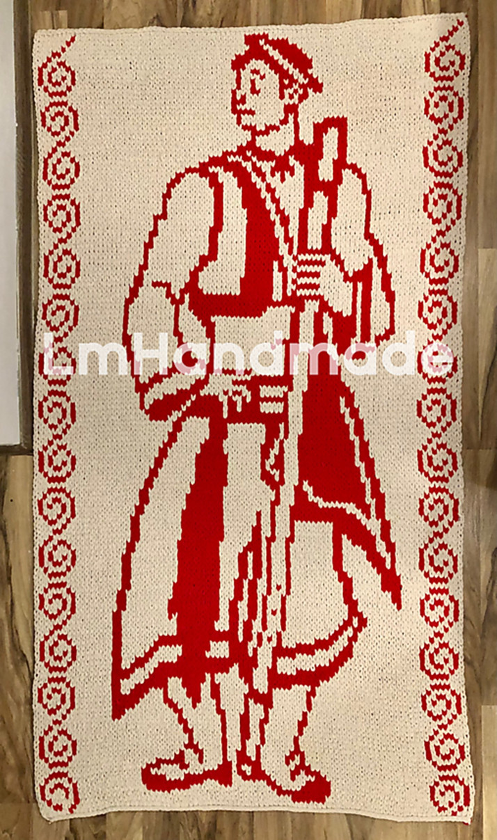Obojstranná deka je vyrobená ručným pletením z priadze Alize Puffy More 6286. Tento typ priadze ponúka v jednom klbku dve rôzne kombinácie farieb. Má obojstranné očká a preto sa najskôr pletie jedna strana deky a potom druhá. Vzor na oboch stranách je identický (na druhej strane zrkadlovo otočený).