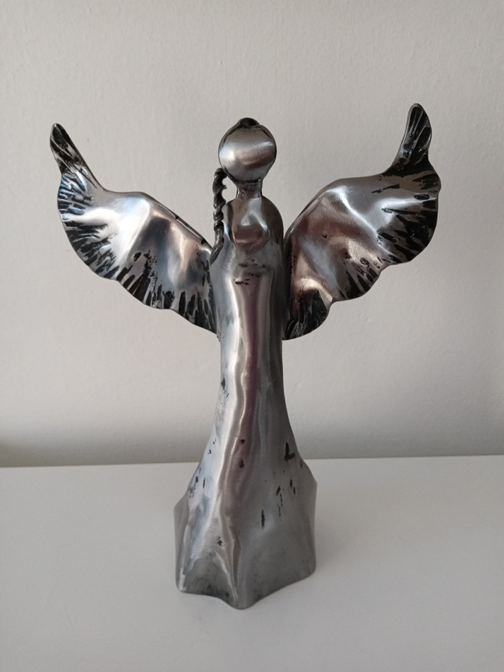 Kovaná soška anděla 36cm vysoká. Černá ocel, leštěná, lakovaná. Cena 9900 kč
