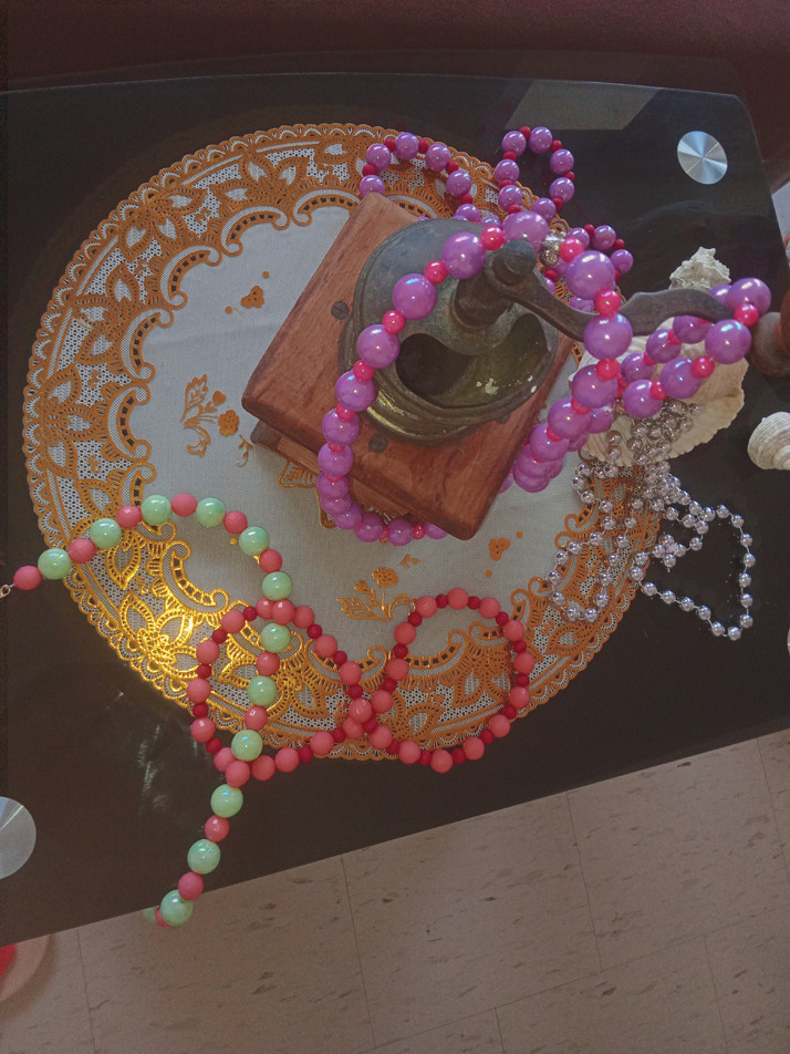 Korálky umělé mezi tím kovové přívěsky.