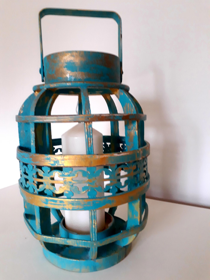 Dřevěný svícen v tyrkysově zlatém provedení.