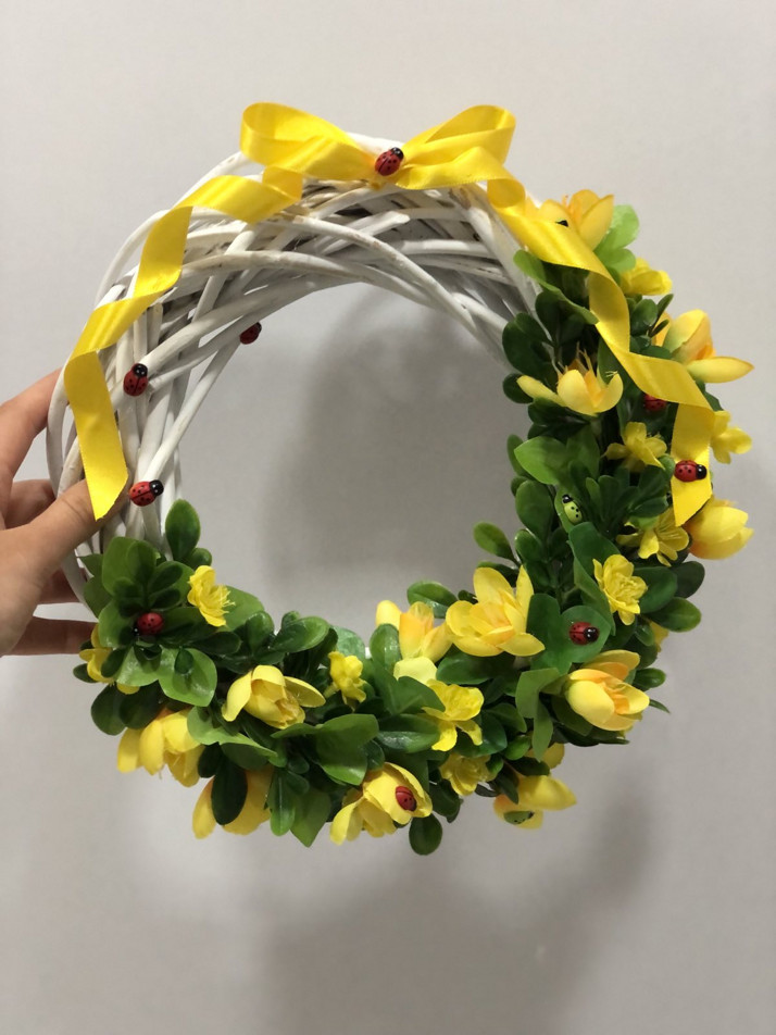 Bílý pleteny věnec s jarní květinovou výzdobou, doplňky, první výrobek uprchlé 21leté Ukrajinky z Oděsy.