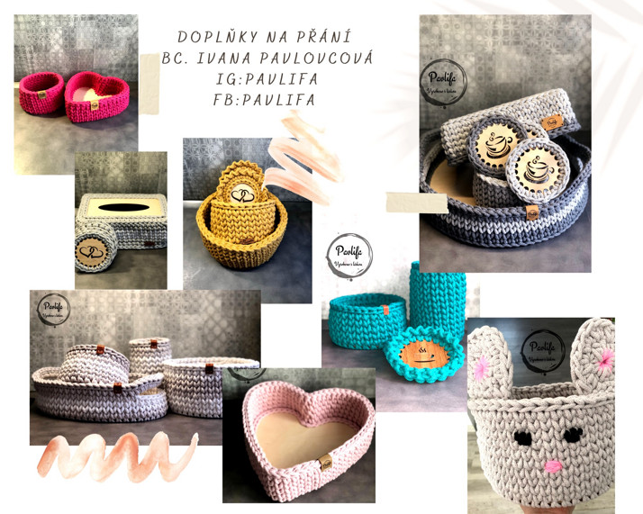 Nabízím různé velikosti, druhy a barvy háčkovaných výrobků - kruh, obdélník, čtverec, srdce, dále také organizér na kosmetiku, box na kapesníky, podnosy a podtácky,..
