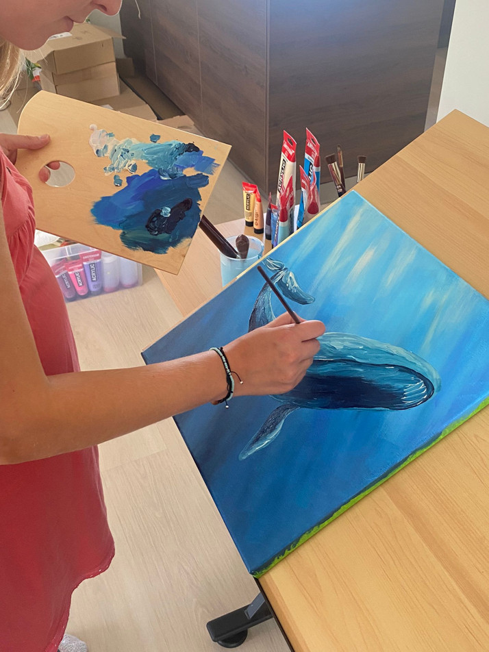 Při malování akrylového obrazu Velryba