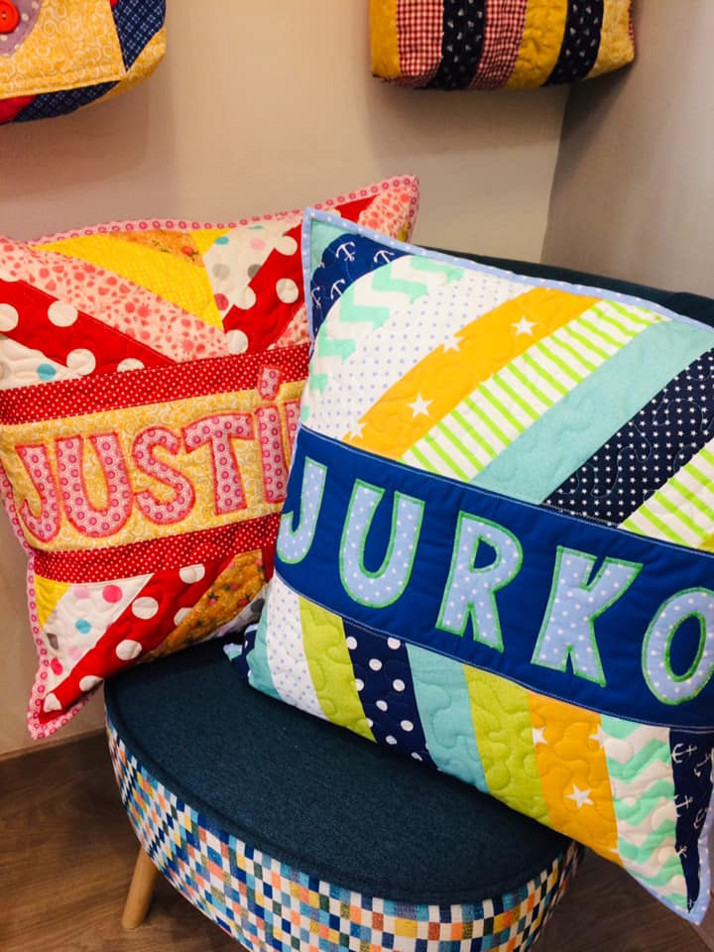Originálne vankúše patchwork, s menom, s aplikáciou. Predná strana je vystužená, prequiltovaná, prešívaná. Výplň je na mieru ku každému vankúšiku.