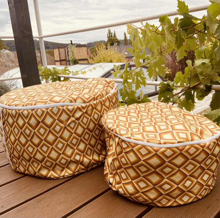 Prodám dva velké taburety které jsou vhodné na terasu, zahradu… použila jsem nepromokavý materiál s nešpinavou úpravou.