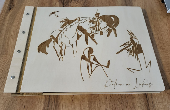 Náš zatím nejnáročnější projekt. Fotoalbum na přání pro naše přátele. Vypálený motiv byl citlivě překreslený podle fotografie obrazu, ke kterému mají naši přátelé velkou citovou hodnotu. Ve spoji pak byla použita namísto koženky pravá kůže.
