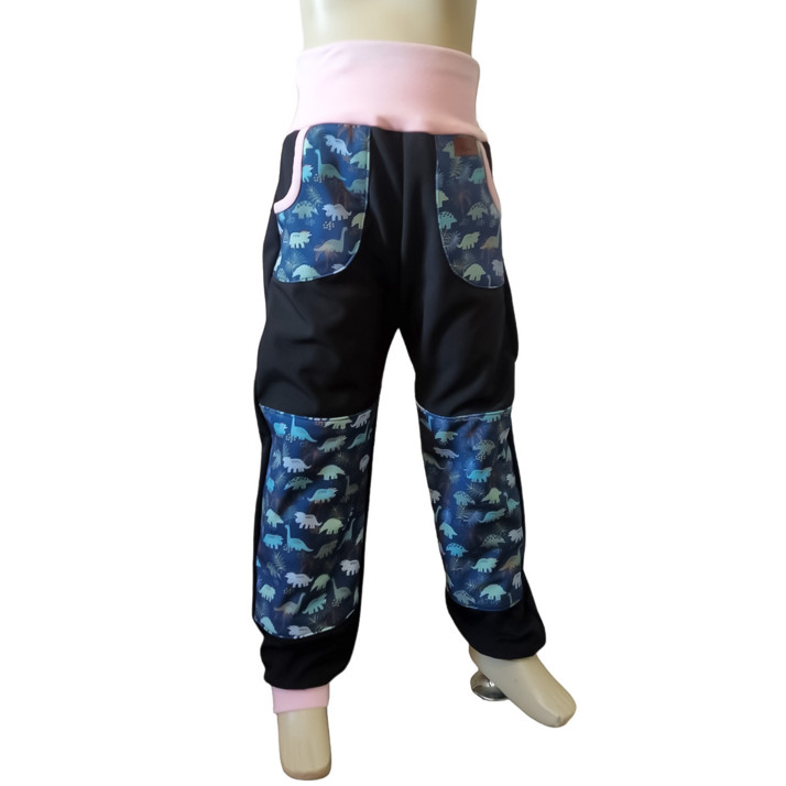 Kalhoty jsou ze zimního softshelu. Se vzorem dinosaurů.