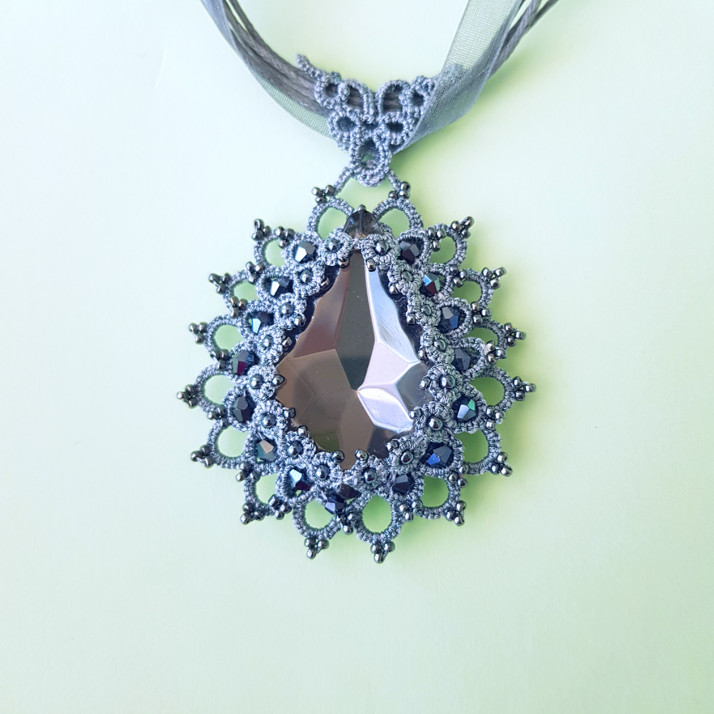 hezký přivěšěk s velkym krystalem v šedé barvě bude elegantim doplnkem vašého öblečení. Rozměry: vyška 5cm, šířka 4cm, šnurek má prodlužovací řetižek.