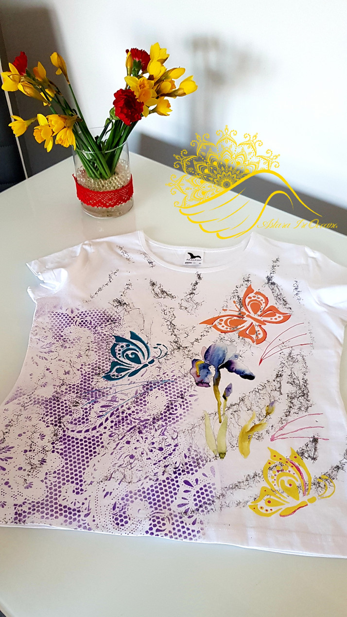 Ruční tvorba malba trička motýl a kytka