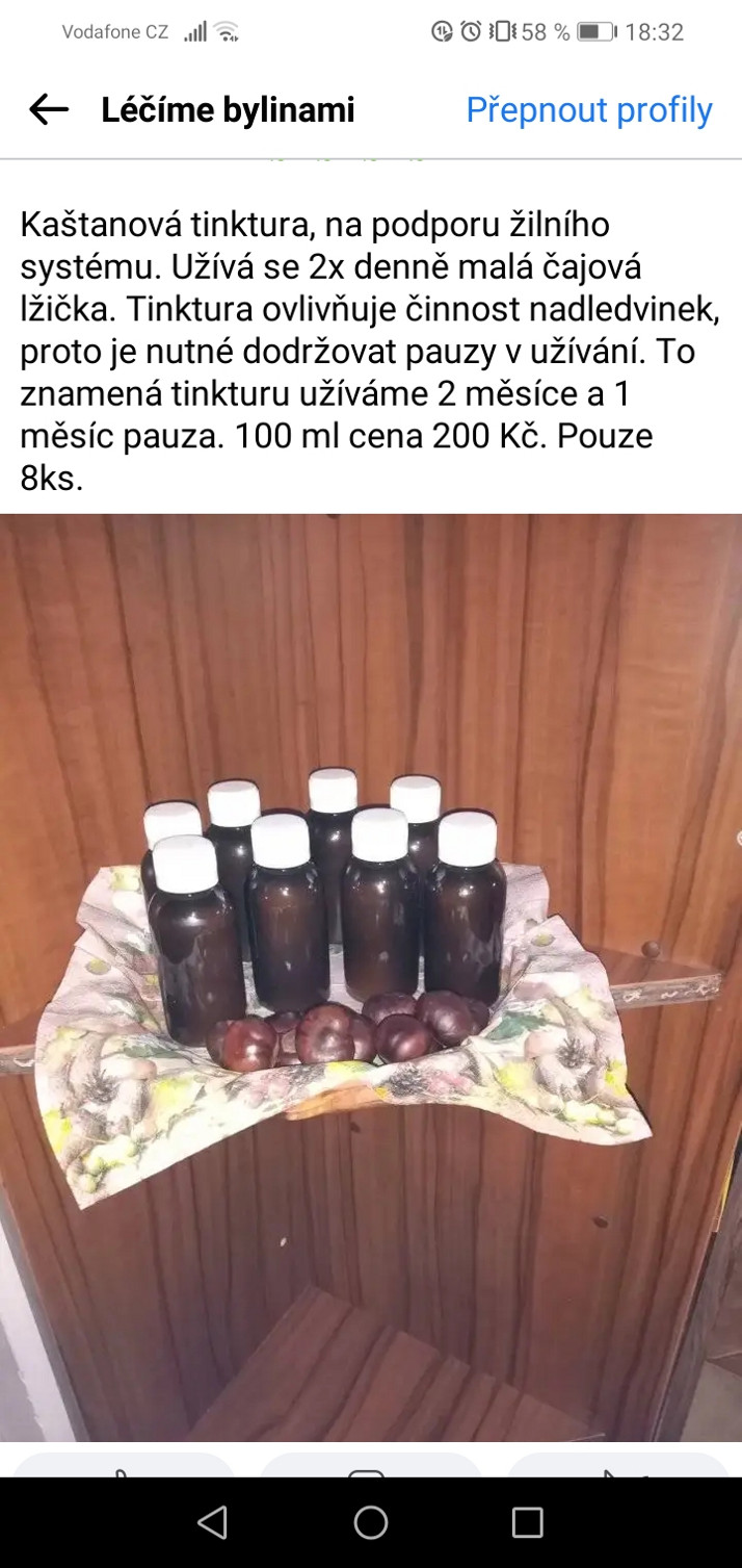 Vhodná na léčbu cévního systému. Využití je vnitřně 2x denně 1 čajová lžička a na vnější užívání na křečové žíly. Tinktura ovlivňuje činnost nadledvinek, proto je nutné dodržovat pauzy v užívání přípravku. To znamená tinkturu užíváme 2 měsíce a 1 měsíc pauza. 100 ml cena 200 Kč.