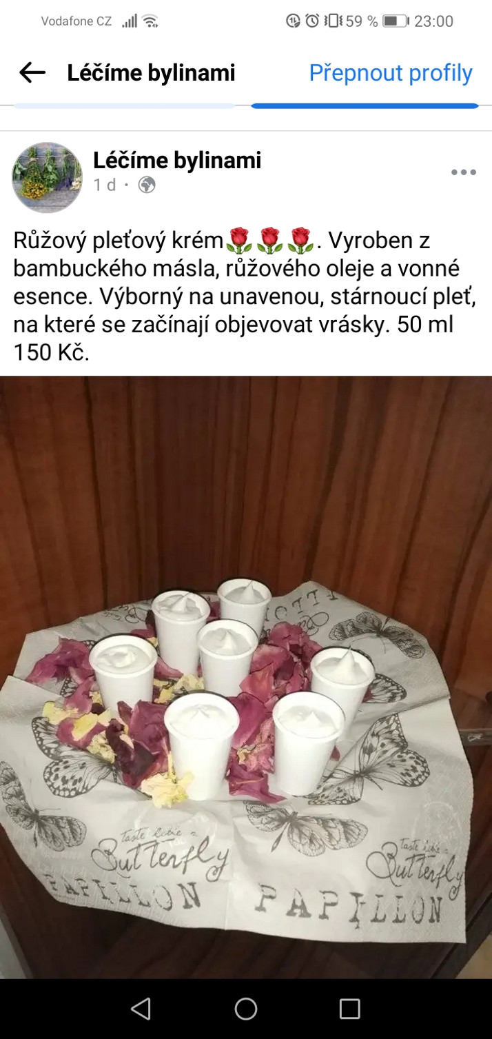 Růžový pleťový krém, který dokáže oddálit stárnutí pleti. Krém je vyroben z bambuckého másla, růžového oleje a vonné esence. Výborný na unavenou pleť, na které se začínají objevovat vrásky. 50 ml 150 Kč.