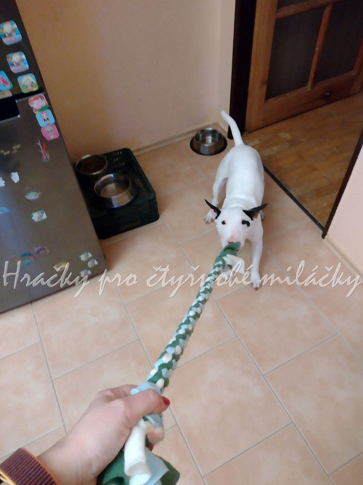 dospělá fenka - mini bull. Velmi ráda se prý přetahuje, vybrali tedy jako přetahovadlo - pevně pleteného peška a chtěli trošku delší variantu. Prý se jí velmi líbí.