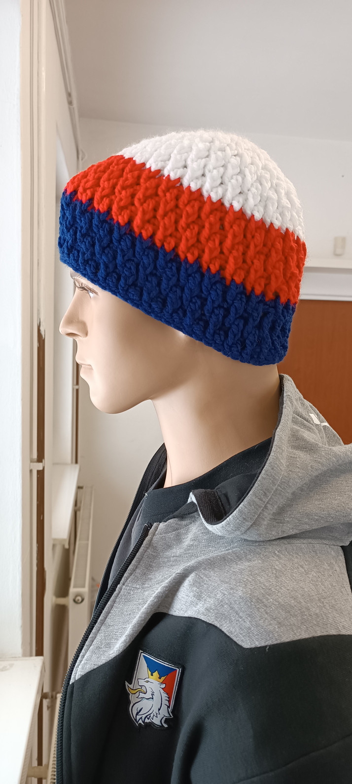 Háčkovaná čepice v barvách vlajky. Lze dodělat bambuli.
