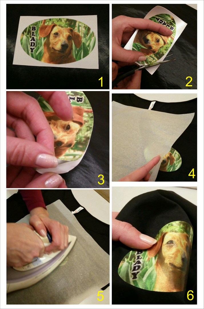 Jenoduchý fotonávod (ukázka) aplikace textilní nažehlovačky s potiskem, které najdete v mé nabídce. Tištěný návod je pak přikládán do zásilky.