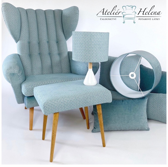 čalounění křesla, podnožky s výrobou polštářů a stínidel.