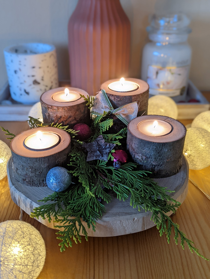 Podstavec z kmene + svícny z větví a čajových svíček