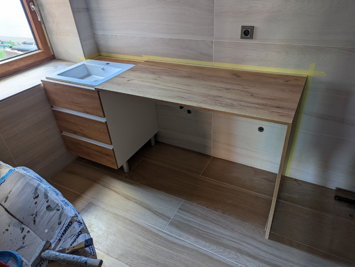 Skříňka pod umyvadlo s prostorem pro pračku a sušičku. Kvůli otvírání okna se muselo umyvadlo posadit o jednu sílu materiálu níže než odkládací plocha nad pračkou, proto si lze všimnout zubu.