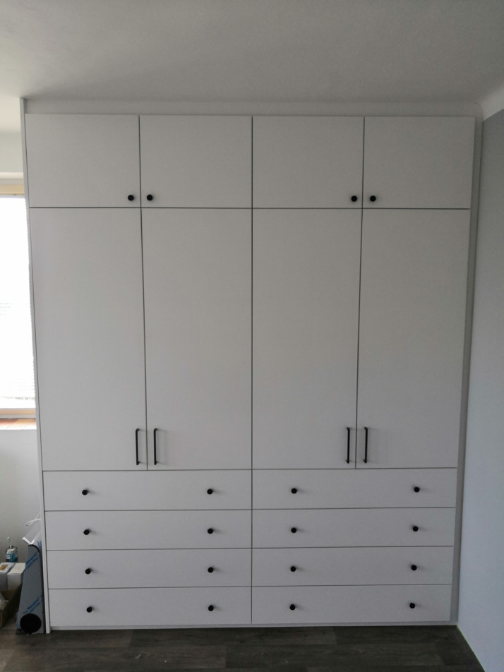Vestavná šatní skříň z alpské bílé pro rozsvětlení interiéru. Základem jsou hluboké šuplíky s plnovýsuvem pro složené oblečení a místo pro ramínka s bundami. U stropu potom odkládací prostor. Panty i pojezdy od firmy Blum s tlumením a plnovýsuvem.