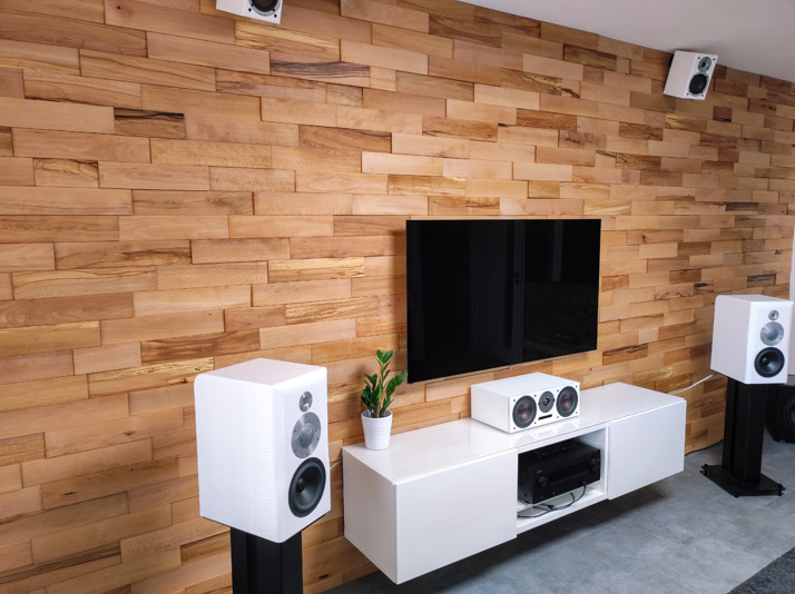 Dřevěné obklady z bukových palet, hoblované a broušené do vysokého lesku, ošetřeno olejem