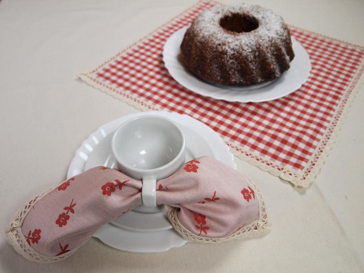 Ubrus a prostírání na chalupu v červené a režné kombinaci.