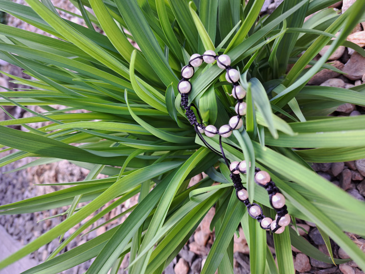 Je vyroben z nilonové šňůrky a voskovaných korálků. Délka 13,5 + 5 cm zapínání, 13 + 5cm zapínání. Cena 100,- Kč.