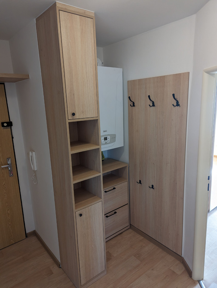 Nábytek na míru do chodby. Záměrem bylo co nejvíc odkládacích prostor. Zákazník měl jasné představy - police nad dveřmi, policová skříň na konci příčky, výklopný botník pod kotel, deska s věšáky na kabáty a bundy.