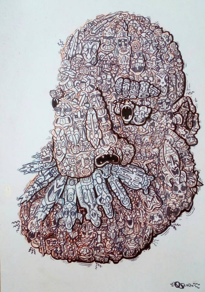 Kresba štětcovým perem a pastelkou na tvrdý A4 papír