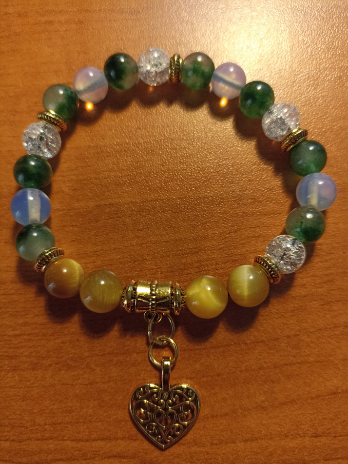 Je náramek z přírodních minerálů chalcedon ledové zelený,podporuje imunitní systém.Minerály z křišťálu a žlutý nefrit.