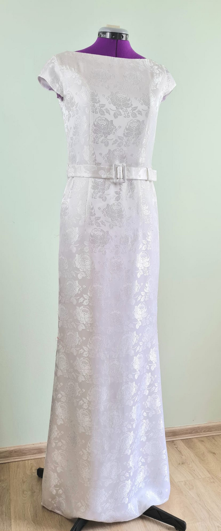Elegantní jednoduchý styl, to jsou sněhově bílé brokátové svatební šaty Gabrielle. Tyto šaty jsou ručně šité z materiálu české výroby, značky HEDVA ČESKÝ BROKÁT s.r.o. Brokát Růže Ecru je jedinečný lesklý materiál s vytkaným květinovým vzorem. Jemnost a hebkost dodává šatům saténová podšívka. Šaty jsou krásně lesklé a splývavé. Skvělým doplňkem šatů je pásek s ručně pošitou sponou ze stejného materiálu.