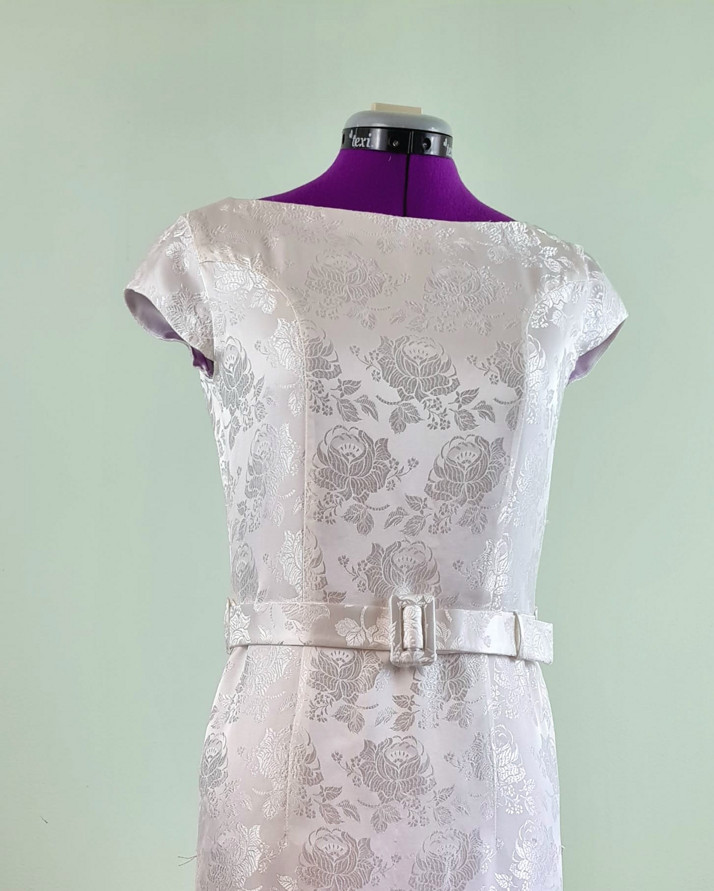 Elegantní jednoduchý styl, to jsou sněhově bílé brokátové svatební šaty Gabrielle. Tyto šaty jsou ručně šité z materiálu české výroby, značky HEDVA ČESKÝ BROKÁT s.r.o. Brokát Růže Ecru je jedinečný lesklý materiál s vytkaným květinovým vzorem. Jemnost a hebkost dodává šatům saténová podšívka. Šaty jsou krásně lesklé a splývavé. Skvělým doplňkem šatů je pásek s ručně pošitou sponou ze stejného materiálu.