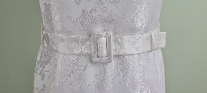 Elegantní jednoduchý styl, to jsou sněhově bílé brokátové svatební šaty Gabrielle. Tyto šaty jsou ručně šité z materiálu české výroby, značky HEDVA ČESKÝ BROKÁT s.r.o. Brokát Růže Ecru je jedinečný lesklý materiál s vytkaným květinovým vzorem. Jemnost a hebkost dodává šatům saténová podšívka. Šaty jsou krásně lesklé a splývavé. Skvělým doplňkem šatů je pásek s ručně pošitou sponou ze stejného materiálu.